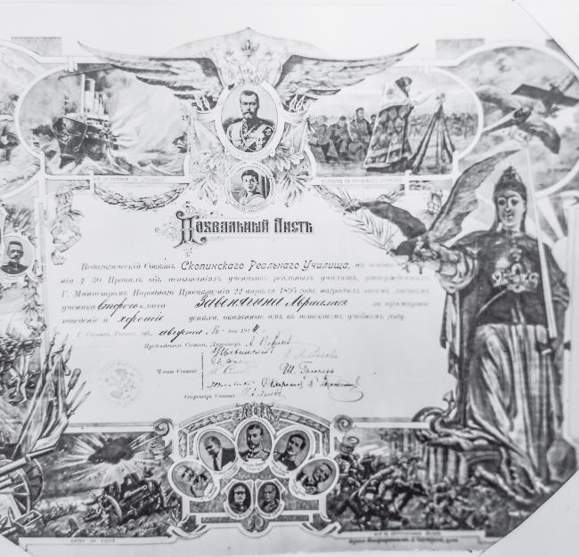 Педагогический совет Скопинского Реального Училища, на основании Правила об испытаниях учеников реальных училищь, утверждённых Г. Министром Народного Просвещения 22 апреля 1895 года, наградили этим листом ученика второго класса Завенягина Авраамия за примерное поведение и хорошие успехи, показанные им в течение учебного года.