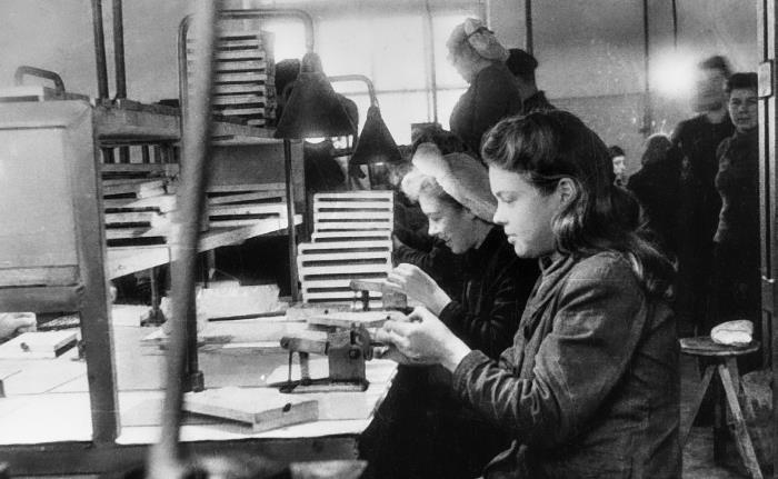 Монтажницы центра миниатюрных лампочек Рязанского электролампового завода А.Н. Смирнова и Л.П. Гусева за монтированием миниатюрных лампочек, 1948 г.