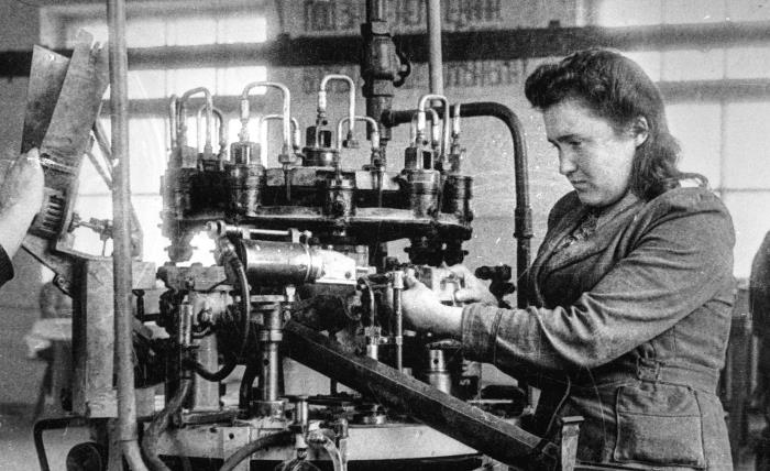 Станочница Рязанского электролампового завода В.И. Соленоваза работой на автомате-колбовыдувателе, 1948 г.