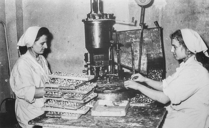 Особо необходимо подчеркнуть тот факт, что цех стекла переключили на выпуск штампованного стекла для светосигнальной арматуры, используемой на самолетах, танках и судах Военно-морского флота. Заводу был присвоен номер 688. После войны цех перешел на выпуск прессованного электроосветительного стекла.[30]