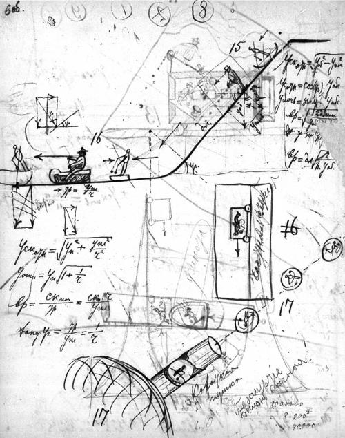 Предмет размышлений Циолковского обширен – физические явления при движении маятника и качелей; вагона, начинающего либо оканчивающего своё движение; в пушечном ядре, где возникает «усиленная тяжесть». Учёного явно беспокоит вопрос о том, как перенесут «усиленную тяжесть» живые существа. Иначе Циолковский не нарисовал бы птицу в жерле пушки или людей в вагонах, движущихся и по прямой, и по кривой.
