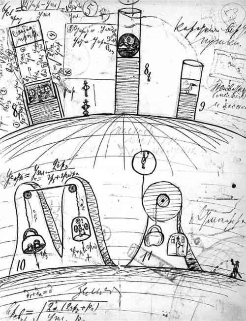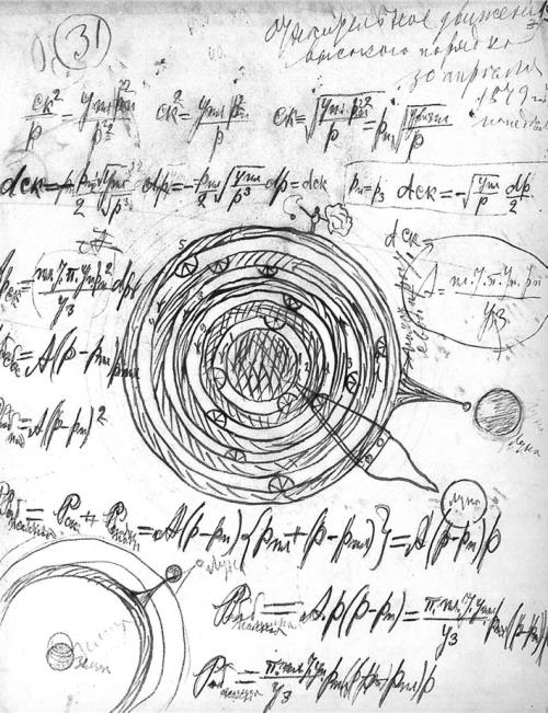 Мы видим на его рисунке канал, рассекающий Землю, и читаем, что «ядро падает через диаметральный земной канал и достигает центра через 20 минут. Относительная тяжесть в ядре исчезает». Невесомость и перегрузка, «веретенообразная башня, висящая без опоры над планетой и не падающая, благодаря центробежной силе» (легко узнается искусственный спутник), и «кольца, окружающие планету без атмосферы, с помощью которых можно восходить на небеса и спускаться с них, а также отправляться в космическое путешествие». – Многие проблемы, впоследствии ставшие предметом рассмотрения больших научно-исследовательских коллективов, нашли отражение в юношеских заметках К.Э. Циолковского, размещённых на страницах обычной школьной тетрадки.