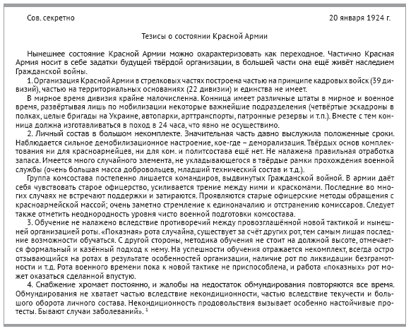 Наглядная картина того сложнейшего положения, которое сложилось в частях и соединениях Красной Армии к концу 1923-го – началу 1924 годов, представлена в докладной записке начальника мобилизационного отдела Штаба РККА Н.Л. Шпектрова, направленной им И.С. Гусеву, который по поручению ЦК РКП(б) возглавлял комиссию по обследованию состояния Красной Армии. В то же время не может не броситься в глаза некое противопоставление красных командиров старым военным специалистам, а точнее сказать, бывшим офицерам царской армии. Докладная записка предлагается вашему вниманию в некотором сокращении.