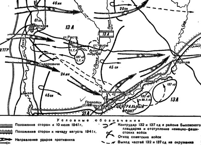 В конце концов, Генеральный штаб распорядился включить 132-ю стрелковую дивизию в состав 13-й армии. 11 июля 132-я стрелковая дивизия получила приказ атаковать противника (передовые части Гудериана) в районе Быхова и сбросить его в Днепр. Объяснить, с каких рубежей и какие дивизии действуют в этом районе, передавший приказ командир из оперативного отдела штаба армии не смог. Лишь несколько позднее задача была уточнена.