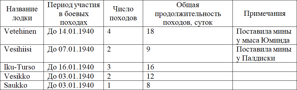 Всего в ходе «Зимней» войны финские ПЛ совершили 12 боевых походов, поставили 39 (по другим данным-36) мин и не выпустили ни одной торпеды. На поставленных ПЛ минах подорвалось и затонуло немецкое судно “Dietrich Hasseldieck” (138 БРТ). Этим и ограничились победы финских подводников.