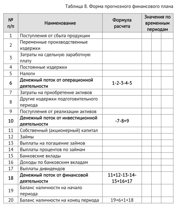 Сумма денежных потоков каждого раздела составляет остаток денежных средств в соответствующий период, баланс денежных средств на конец расчетного периода равна сумме баланса на конец предыдущего периода с остатком денежных средств текущего периода. Основным условием построения финансового плана является обеспечение положительного остатка денежных средств во все периоды времени от начала проекта до выбранного горизонта планирования. Таким образом, финансовый план демонстрирует движение денежных средств и отражает деятельность предприятия в динамике от периода к периоду. Финансовый план – основной документ для определия потребности в капитале для выработки схемы финансирования проекта и для оценки его эффективности.