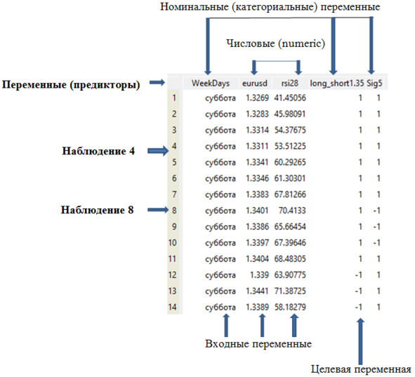 Категориальные (categorical) данные, известные также как номинальные атрибуты, качественные данные, факторы имеют значения, которые не имеют масштаба. «Лонг/шорт», день недели являются примерами таких данных. «Лонг» не больше и не меньше «шорта». Категориальная переменная, которая имеет два значения, как у нас – (лонг, шорт) называют бинарной (двоичной) переменной. Категориальная переменная «день недели» имеет семь значений.