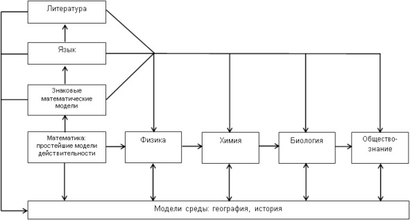 Так уж работает мозг, что знаковые системы формируются на первых стадиях развития его адаптационных реакций. То есть – одновременно с формированием образных представлений. Мозг оперирует количественными характеристиками того, что дается ему в опыте, то есть величинами. Следовательно, любые способы отражения действительности при их осознании нуждаются в математическом описании. При этом образное описание, в конечном итоге, тоже сводится к знаковому. Именно поэтому простейшие знаковые математические модели ложатся в основу средства общения людей при помощи знаков и символов, то есть в основу языка. Учащиеся пятых классов общеобразовательной школы, проходящие специальный курс адаптации к предметному содержанию образования в основной школе, самостоятельно приходят к выводу, что «математика – это язык, язык – это математика». Далее (см. схему) язык, в основе которого лежат знаковые математические модели, обеспечивает формирование всех других моделей, совершенствуясь и усложняясь по мере усложнения этих моделей.