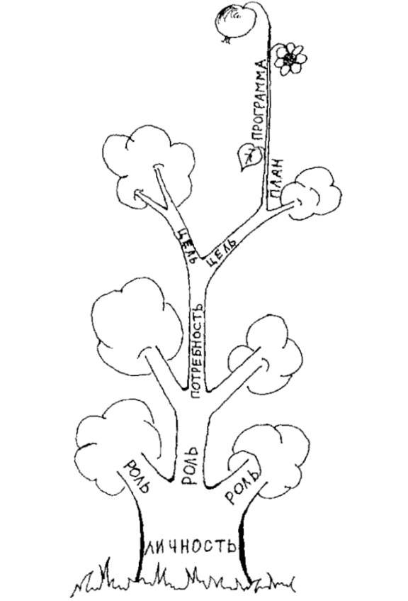 Потребности осознаются для того, чтобы их удовлетворять (или, в крайнем случае, осознанно отказаться от их удовлетворения). Для удовлетворения каждой потребности есть, как правило, несколько возможностей. Поэтому ветки, в свою очередь, разделяются на Это – , достижение которых удовлетворяет потребности соответствующей роли личности. веточки. цели