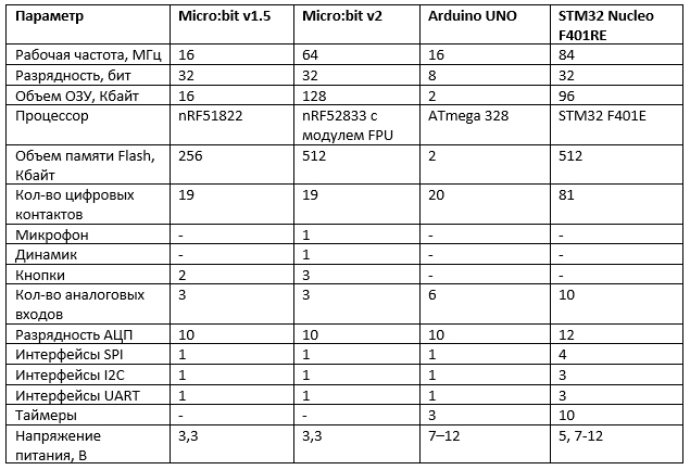 В табл. 1 вы найдете сравнение характеристик micro:bit версии 1.5 и 2 с другими широко распространенными микроконтроллерами – Arduino UNO и STM32 Nucleo F401RE.