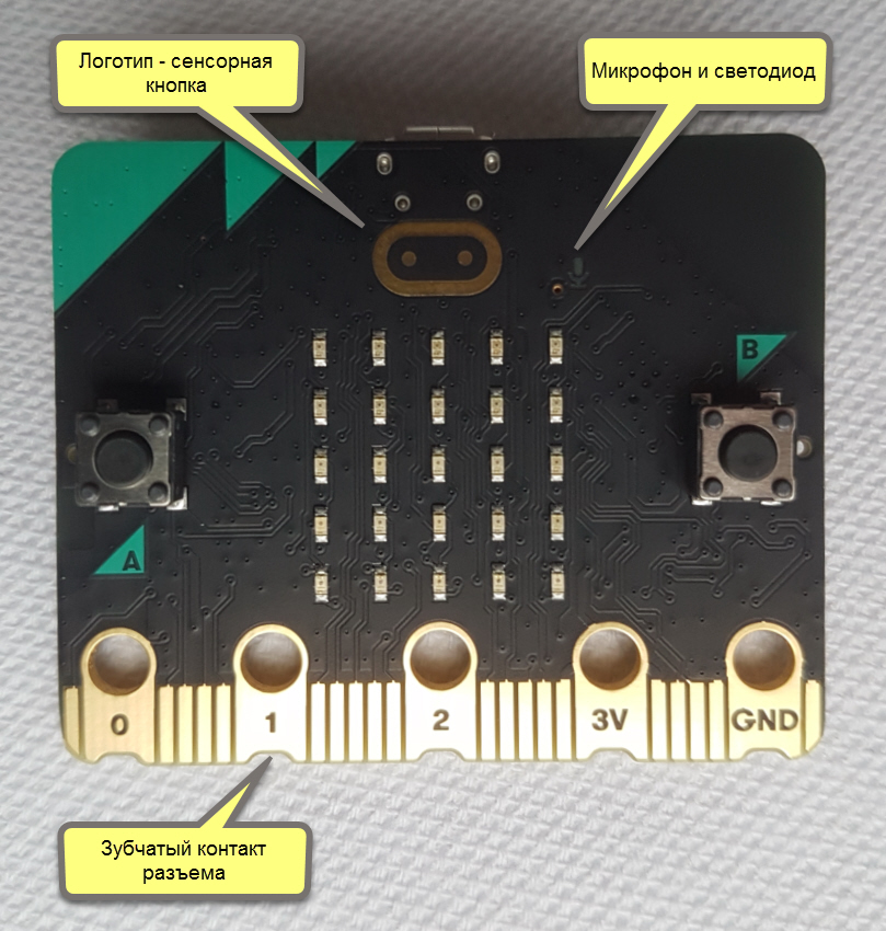 Рис. В.5. Сенсорная кнопка в виде логотипа, микрофон и светодиод на плате micro:bit v2