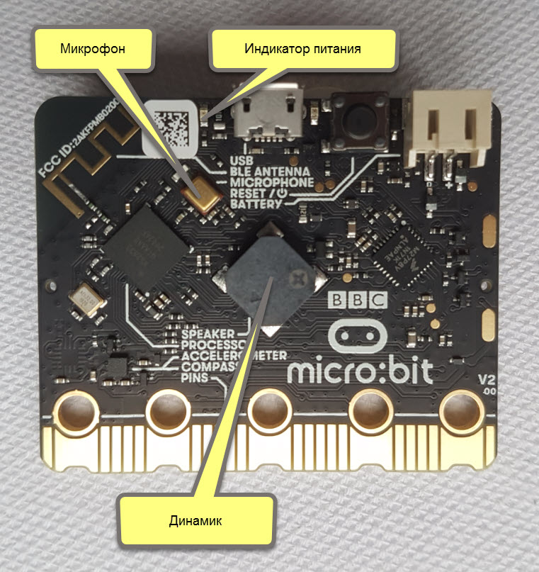 Рис. В.6. Микрофон, индикатор питания и динамик на плате micro:bit v2