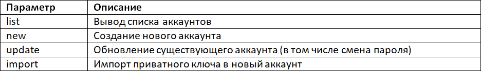 Параметры команды geth account