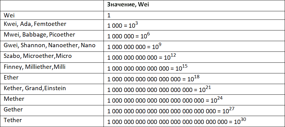 В таблице 4.2. мы привели полный список денежных единиц Ethereum и их ценность в единицах Wei.