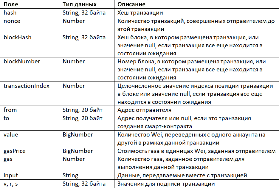 Содержимое полей gasPrice и gas имеет отношение к стоимости транзакции. Пока мы работаем с тестовой сетью, об этом можно не беспокоиться. Если кратко, то gasPrice содержит так называемую стоимость газа, который тратится на выполнение транзакции, а поле gas – количество газа, которое выделил отправитель для выполнения транзакции.