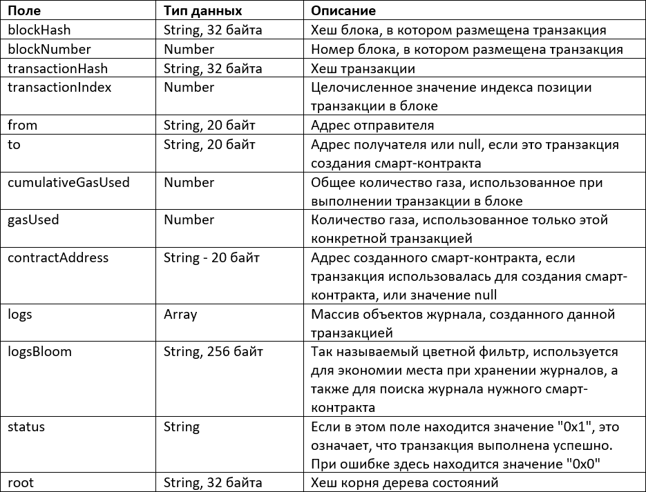 Также обратите внимание на поле contractAddress. Когда мы займемся публикацией смарт-контрактов, нам потребуется адрес размещенного смарт-контракта из этого поля.