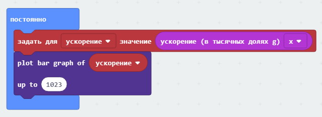 Здесь мы определяем переменную ускорение, после чего запускается бесконечный цикл. В цикле в эту переменную записывается значение ускорения в тысячных долях g, полученное от акселерометра micro:bit.