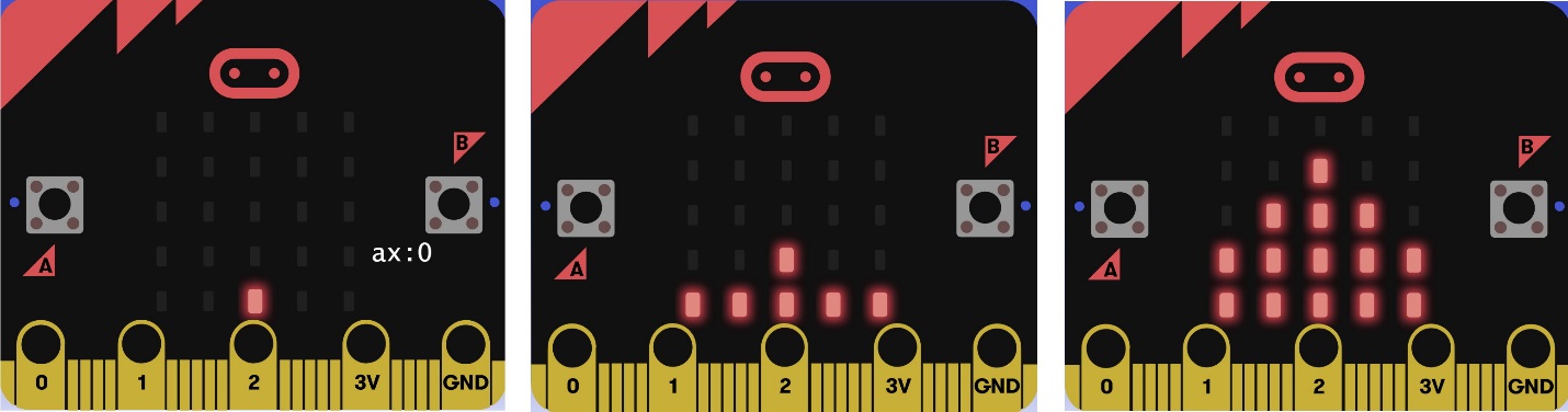 Если потихоньку трясти плату микрокомпьютера, то вы увидите быстро меняющуюся гистограмму (средняя и правая картинка на рис. 5.11). Чем сильнее вы будете трясти плату micro:bit, тем больше будет высота линий, нарисованных на экране.