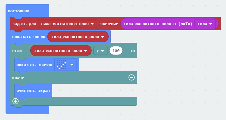 В бесконечном цикле наша программа показывает на экране micro:bit численное значение интенсивности магнитного поля в микротеслах. Если интенсивность превышает 100 мкТл, то на экране отображается значок галочки, если она меньше этого значения – экран стирается при помощи блока очистить экран.