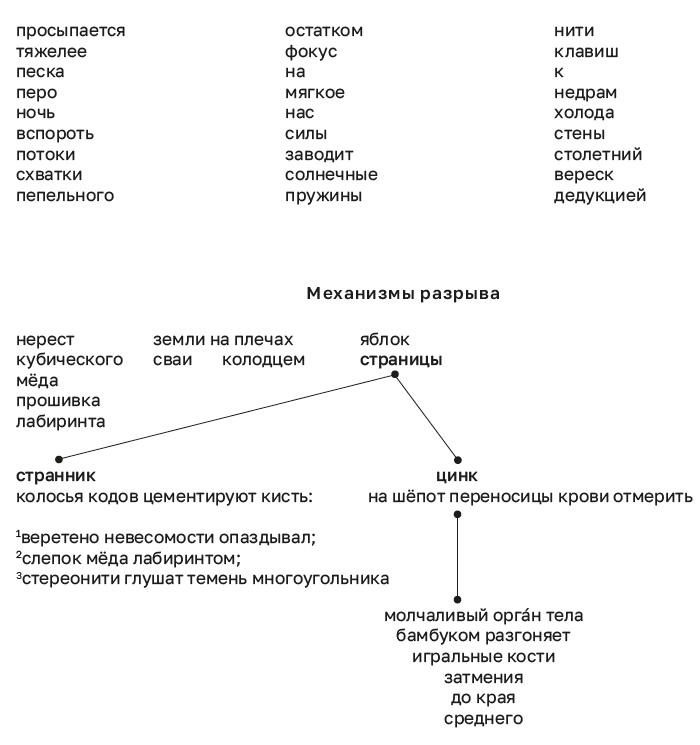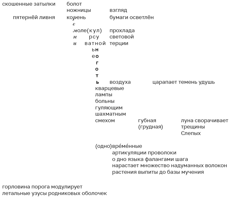 «Зерно барабана неистово фосфором на спайках колодца и глаза.Туземны тюбики аэроплана (кости языка). Землисты лица пуль, запечённых в замыкании.Изотермия пространства.Скопление полых лексем, о гекзаметры нуля подсвеченных: нарывы галактик.Эстетика мигающих дистанций,укрупняясь в тонкость листа, раздавая костры шаровые. Бестиарий шелка полнокровно пытался лесом.Почки индукции:нити пуль подбираются к барабану зерна. Они – ниже земли.ноль льётся рифмуя костры дистанций фурункул скопления на подсвечник слога ярче: вскрыт восклицанием.Мгла: Точка