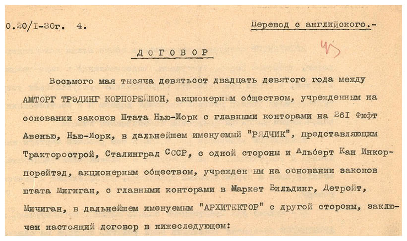 8 мая 1929 года с Бюро А. Кана подписывается контракт на проектирование и руководство строительством Сталинградского тракторного завода{147}. Сумма контракта составляет 130 тыс. долларов США (сегодня эта сумма примерно равна 2 млн долларов США). Фактически, выражаясь языком современной терминологии, заключается аналог EPC-контракта (сокр. от англ.: engineering, procurement and construction), при использовании которого исполнитель выполняет: