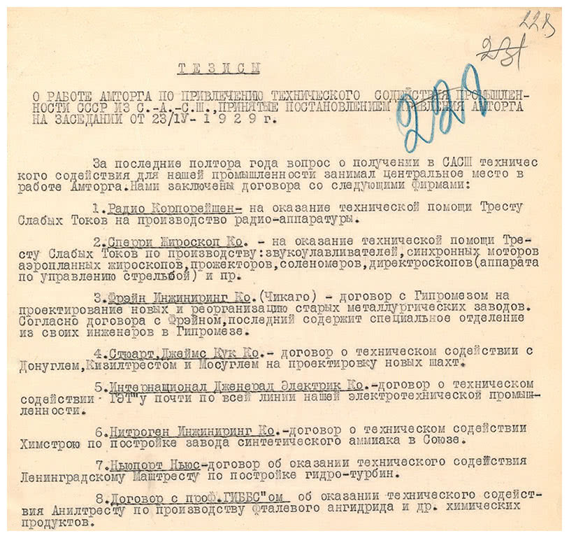 В тех случаях, когда выгоднее сотрудничать не с американскими специалистами, а с компаниями, такое сотрудничество системно разворачивается. Одной из иллюстраций, характеризующей организованное взаимодействие с американским бизнесом, является официальный доклад Амторга о работе по привлечению технического содействия из США для развития промышленности страны от 23 апреля 1929 года: