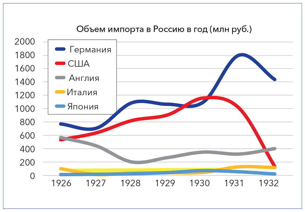 Суммарно объем экспорта из США в Россию с 1926 по 1931 год оценивается Министерством торговли США в 491,7 млн долларов. Сегодня эта сумма соответствует более 50 млрд долларов. Доля экспорта США в нашу страну возрастает с 1,33 % в 1927 году до 4,17 % – в 1931-м{195}. Американский экспорт в Россию увеличивается на 233 % по сравнению с экспортом США в нашу страну до Первой мировой войны{196}.