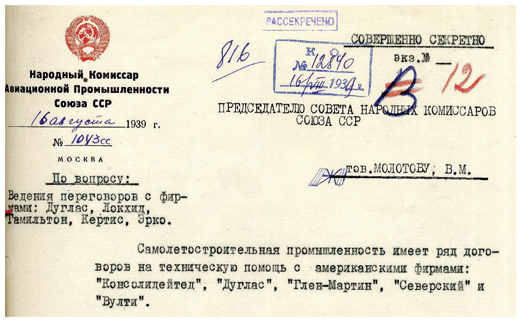 Так, например, 16 августа 1939 года министр авиационной промышленности обращается к председателю Правительства со следующей проблемой: «Самолетостроительная промышленность имеет ряд договоров на техническую помощь с американскими фирмами "Консолидейтед", "Дуглас", "Глен-Мартин", "Северский" и "Вулти". В ближайшие месяцы сроки договоров с американскими фирмами истекают. [При этом крайне важно] использовать положительные особенности американских конструкций в ‹…наших› самолетах, а также обучить на американских заводах около 200 наших специалистов»{204}. Предлагается продлить действующие контракты, что «даст возможность обучить значительную группу наших конструкторов и производственников американским методам проектирования и производства самолетов. Технические условия на постройку самолетов будут нами разработаны в соответствии с последними достижениями авиации. Считаю такую форму техпомощи целесообразной».