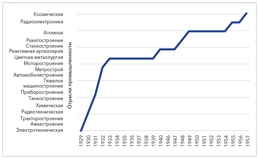 Рис. 49. Выборка отраслей, характеризующих тенденцию технологического развития экономики (без учета военных лет)