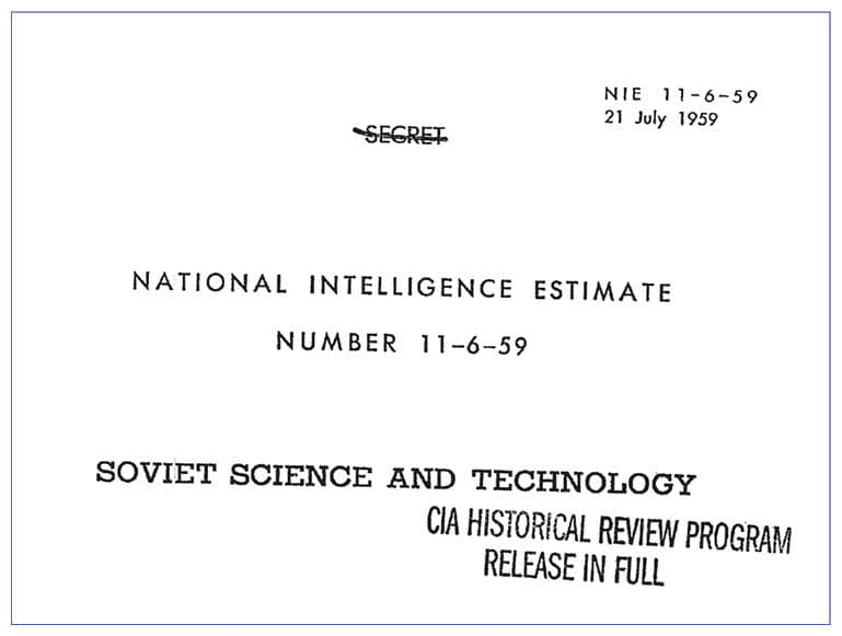 Оценка отечественного уровня науки и технологий Центральным разведывательным управлением США{249} дается в ранее секретном обзорно-аналитическом документе ЦРУ США, датированном 21 июля 1959 года. В его подготовке приняли участие ведущие специалисты ЦРУ, других разведывательных организаций, а также армии, флота и Комиссии по атомной энергии США. Исследование подготовлено для высших государственных и военных деятелей Соединенных Штатов.