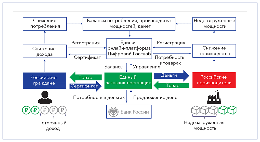 Второе. Для удовлетворения спроса через восстановление упавшего отечественного производства определяется единый заказчик-поставщик, осуществляющий по рыночным ценам массовую закупку товаров первой необходимости, потреблявшихся до кризиса пострадавшими гражданами. В силу централизованного и массового характера закупки есть возможность установления значительной скидки к рыночной цене, что, в свою очередь, будет снижать инфляцию. Также за счет этого возможны импортозамещение и дополнительный выпуск отечественных товаров.