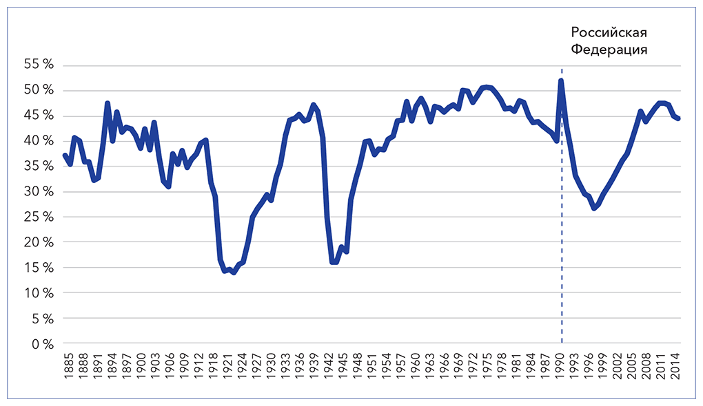 Рис. 87. ВВП на душу населения в России в % к США, 1885–2016 гг.{559}