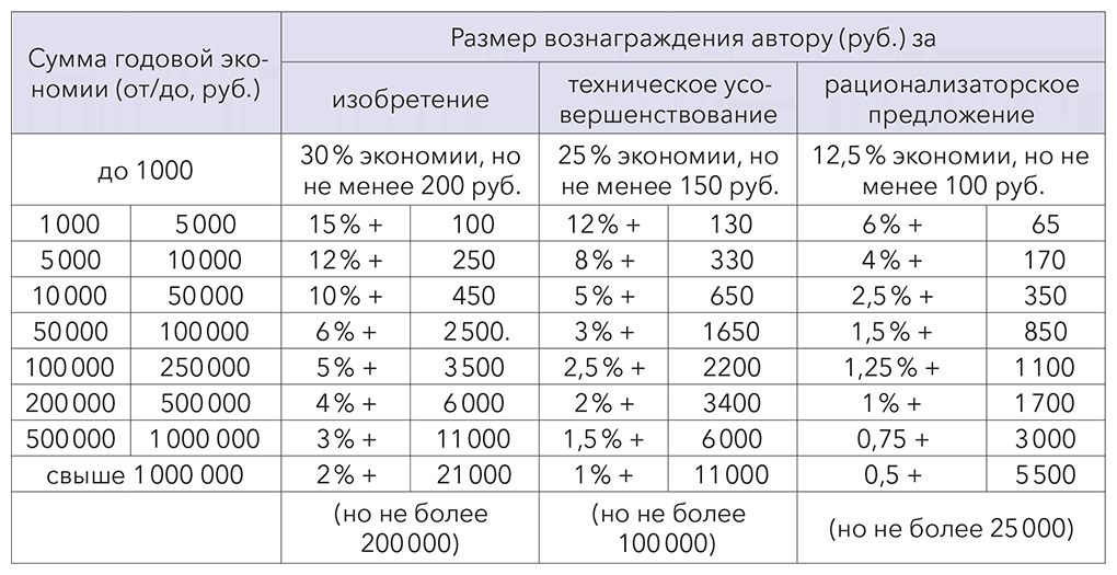 Таблица 17. Размер вознаграждения автору за изобретение, техническое усовершенствование, рационализаторское предложение (в руб.){565}