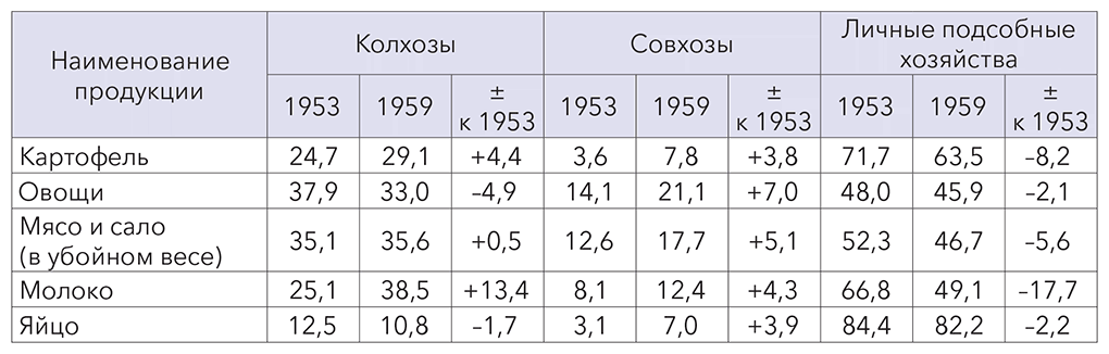 Таблица 19. Темпы роста производства картофеля, овощей, мяса, молока и яиц по категориям хозяйств за период 1953–1959 гг. (6 лет) в % к данному продукту в натуре{566}