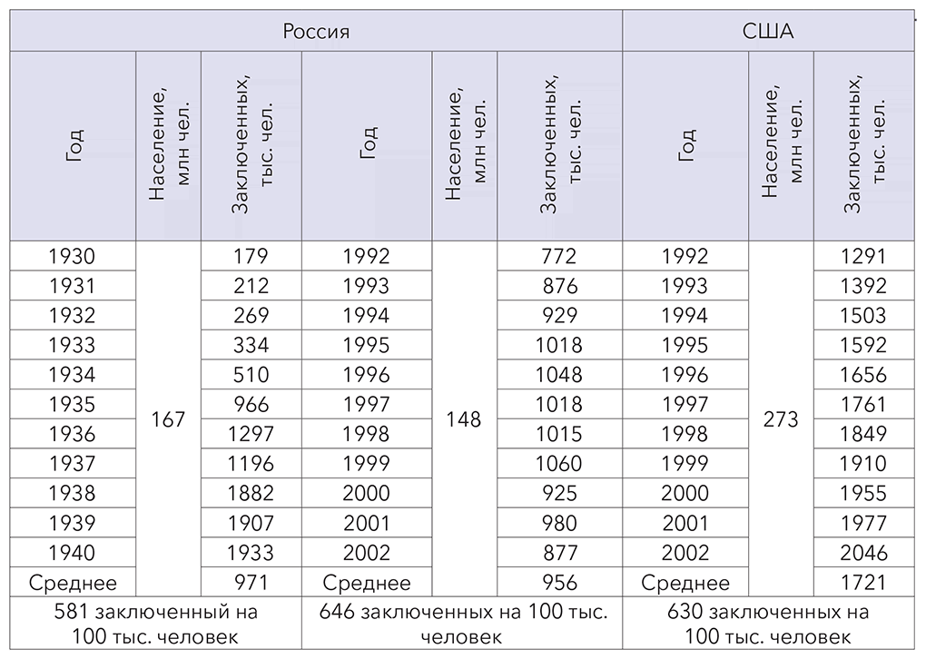 Таблица 22. Среднее количество заключенных на 100 тыс. человек населения в России и США{569}