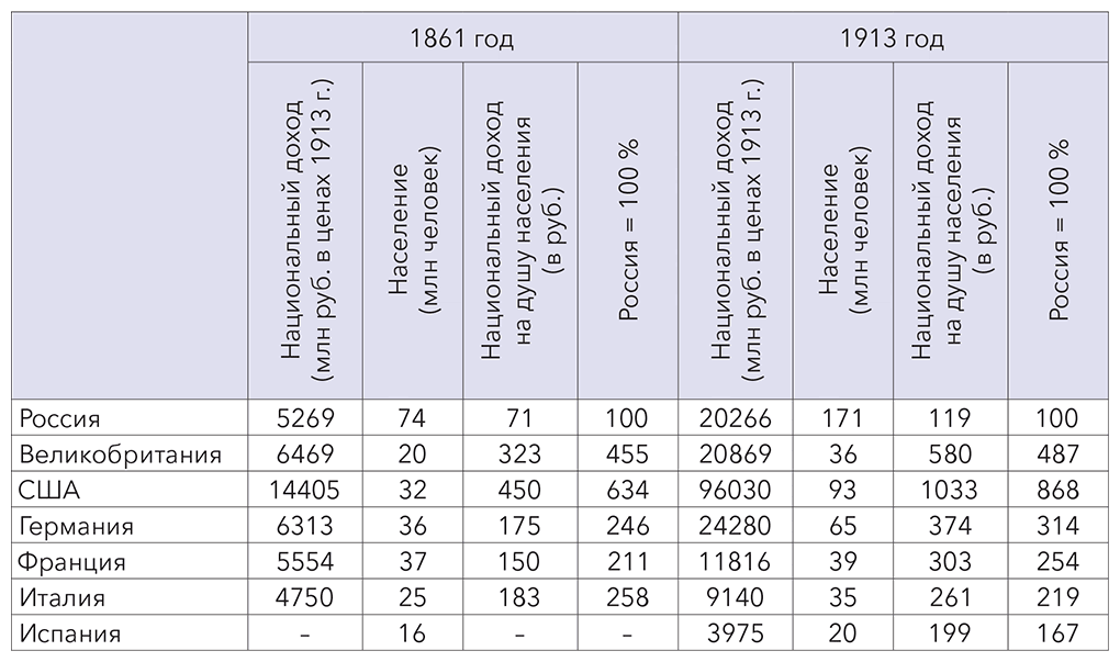 В целом отечественная экономика к 1913 году занимает 5 место в мире после США, Германии, Великобритании, Франции, отставая в частности по объемам промышленного производства в 14,3 раза от США, в 6 раз от Германии, в 4,6 раза от Великобритании, в 2,5 раза от Франции, а по средней урожайности хлебов в 1909–1913 годах отставая в 3,4 раза от Германии и в 2 раза от Франции, по производительности труда – в 9 раз от США. – Е. Г. Ясин, Российская экономика. Истоки и панорама рыночных реформ. – Москва, 2019, с. 16–17.