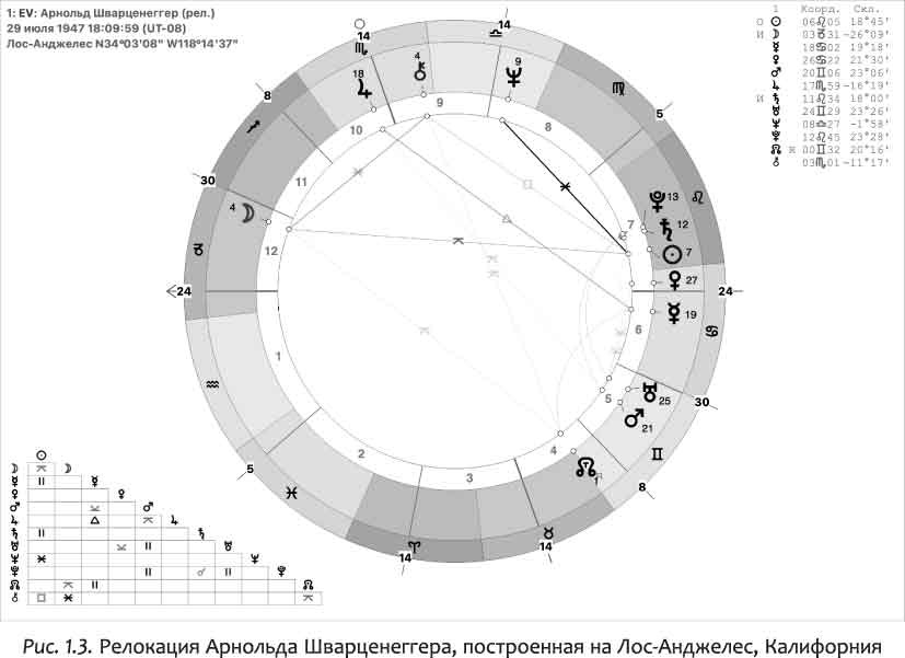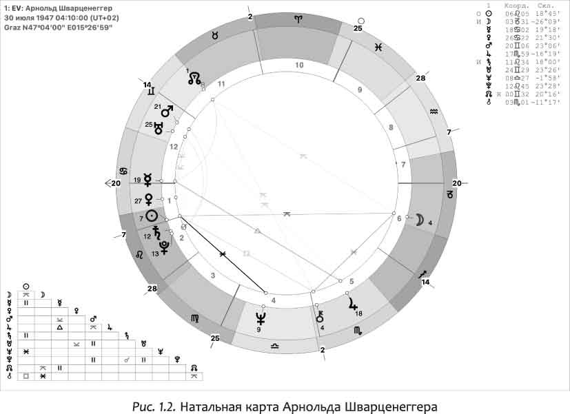На рис. 1.2 показана натальная карта Арнольда Шварценеггера. Он родился в Австрии, в городе Грац.