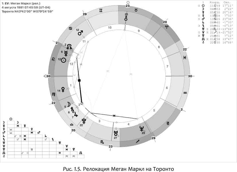 Предвещает ли натальная карта Меган сколько-нибудь успешную карьеру или заметное положение в обществе? Я бы в этом усомнился: управитель МС Марс спрятан в 12-м доме и расположен в знаке своего падения. Действительно, Меган вспоминает, что в начале карьеры у нее были трудности с получением ролей, ей приходилось подрабатывать. Ради наиболее успешной из ее ролей в кино Меган пришлось проводить по девять месяцев в году в Торонто, то есть она фактически переехала туда. Логично было бы взглянуть на релокацию, построенную на Торонто, и эта карта показана на рис. 1.5. В ней управительницей МС становится Венера, расположенная в 1-м доме, – один из классических признаков успеха, хотя успеха ограниченного, ведь Венера расположена в знаке своего падения.
