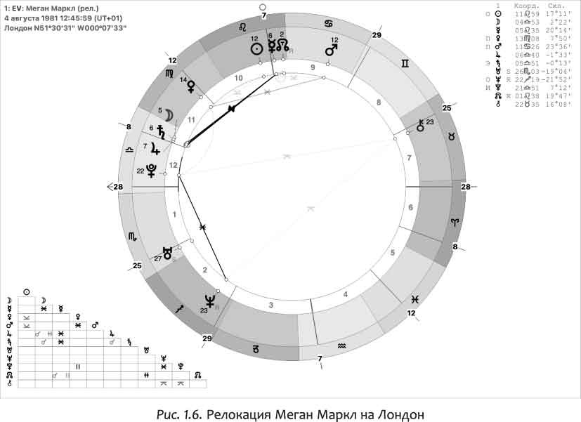 Давайте теперь посмотрим на натальную карту Меган, супруги принца Гарри (рис. 1.4).