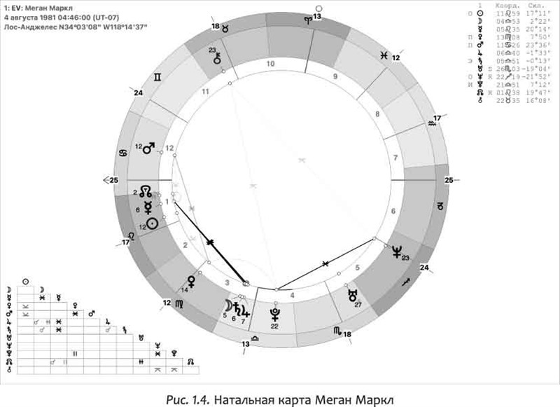 Давайте теперь посмотрим на натальную карту Меган, супруги принца Гарри (рис. 1.4).