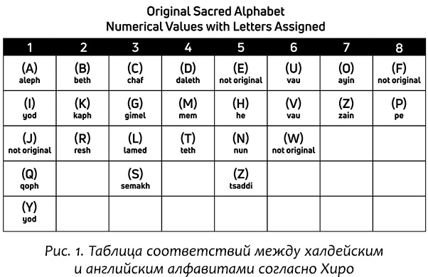 Так вот, именно в этой книге Хиро и предложил соответствие между английским алфавитом и тем, что он называет «древним халдейским и алфавитом иврита» (ancient Chaldean and Hebrew alphabet). Поскольку нам известно, что халдеи были семитским народом, вполне вероятно, что их алфавит дошел до нас как алфавит иврита, и отсылка к халдеям («халдейская нумерология») сразу же приобретает смысл.