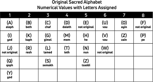 Так вот, именно в этой книге Хиро и предложил соответствие между английским алфавитом и тем, что он называет «древним халдейским и алфавитом иврита» (ancient Chaldean and Hebrew alphabet). Поскольку нам известно, что халдеи были семитским народом, вполне вероятно, что их алфавит дошел до нас как алфавит иврита, и отсылка к халдеям («халдейская нумерология») сразу же приобретает смысл.