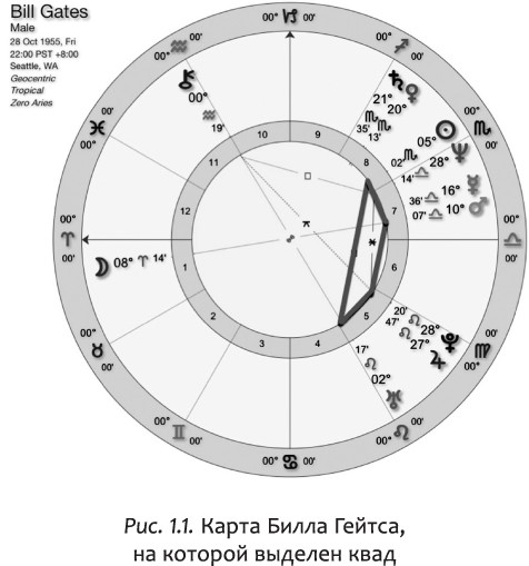 Классический пример – натальная карта Билла Гейтса (рис. 1.1), человека без сомнения успешного. Мы можем сразу обратить внимание на Аспект Супер-Успеха – точное соединение Юпитера и Плутона. Однако важность этого соединения еще более повышается, когда оно участвует в симметричной конфигурации. Видите обведенный симметричный четырехугольник в форме трапеции? Это очень интересное сочетание планет, которое называется квадом, мы упоминали о нем. Между образующими квад планетами могут быть аспекты, но это не обязательно. Главное, чтобы две стороны были параллельны друг другу. Мы будем учиться находить такие квады в натальных картах и интерпретировать их в главе 2[2]. Мы увидим, что практически в каждой карте можно найти квад, иногда и несколько. Важно, какие планеты их образуют. У Гейтса это пары Солнце-Уран и Юпитер-Нептун, то есть пары, которые сами по себе образуют Супер-Аспекты и потому важны. Однако особенным Билла Гейтса делает соединение Юпитер-Плутон в одной из вершин квада. Это очень сильно и значимо, можно сказать, это и есть конфигурация Супер-Успеха. В другой вершине – соединение Меркурий-Марс, само по себе оно не повышает уровень значимости квада, но тот факт, что в двух вершинах квада находятся соединения, переводит его в другую, более влиятельную категорию. Именно этот квад говорит нам, что Гейтс способен достичь значительных высот.