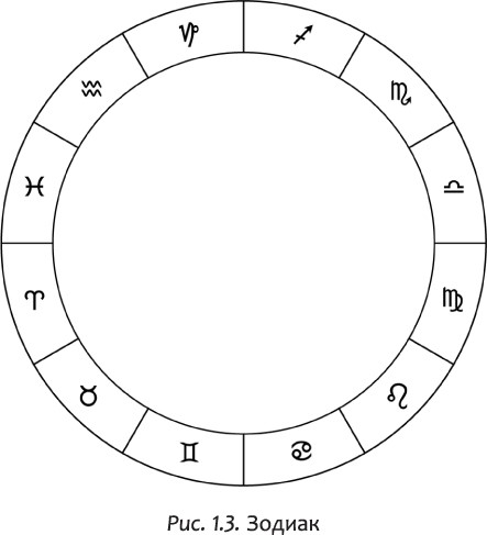 Зодиак – это символическое изображение звездного неба. На самом деле он изображает не все небо, а лишь ту узкую дорожку среди звезд, по которой движется Солнце и вдоль которой перемещаются планеты. Остальная часть неба нас интересует нечасто. Вы видите (рис. 1.3), что на небесной дороге зодиака есть своего рода «верстовые столбы».