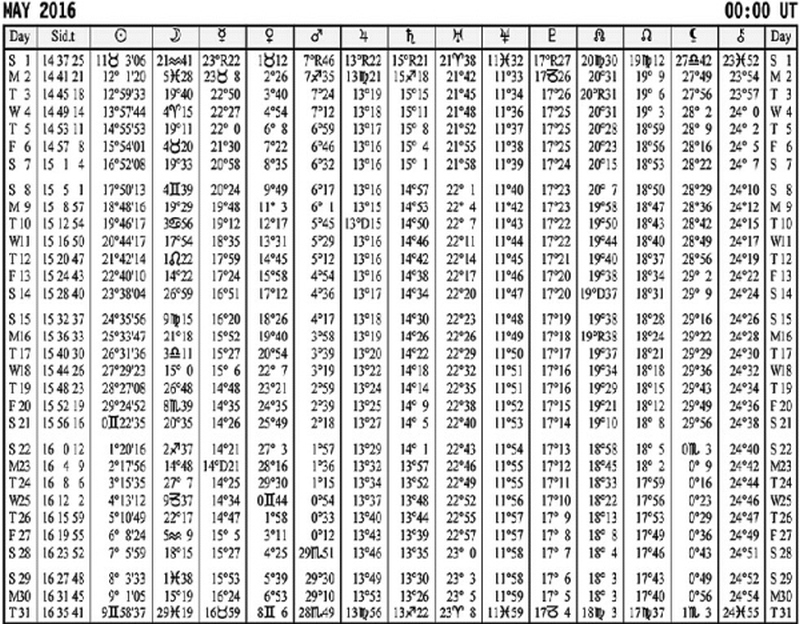 Рис. 7. 3. Таблица эфемерид на май 2016 года