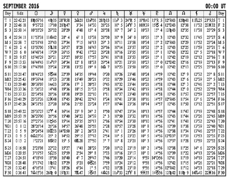 Рис. 7. 4. Таблица эфемерид для сентября 2016 года