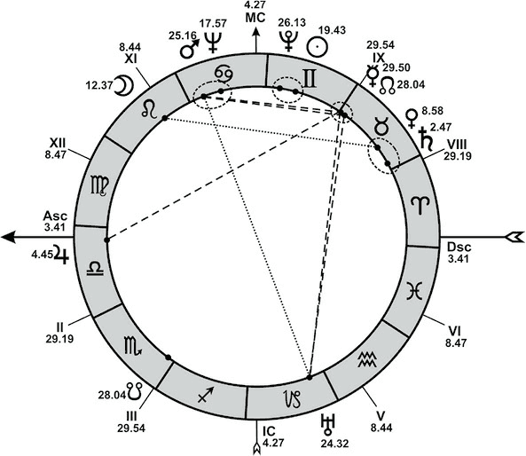 • В IX доме находим Меркурий (как уже сказано, на самом куспиде), Солнце и Плутон.