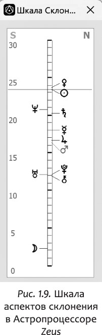 Его можно найти в программе, выбрав «Анализ» на панели управления, а затем в выпадающем меню кликнув на строке «Шкала склонений». Перед вами появится небольшое окошко, подобное изображенному на рис. 1.9. Посмотрите, склонения измеряются в диапазоне от 0° до 30°, поскольку дальше 30° от небесного экватора ни одна из планет не отклоняется. 0° указано внизу шкалы, 30° – вверху. Склонения, как мы уже говорили, бывают северные и южные. Слева вы видите те планеты, которые имеют южное склонение (S), а справа те, что имеют северное склонение (N). Посмотрите, Плутон и Хирон расположены рядом, оказываются в одной точке, и мы сразу видим, что они находятся в параллели, а Уран, поскольку тоже имеет примерно такое же склонение, но южное, стоит с другой стороны, то есть между Хироном и Ураном существует контрпараллель. То же самое между Плутоном и Ураном.