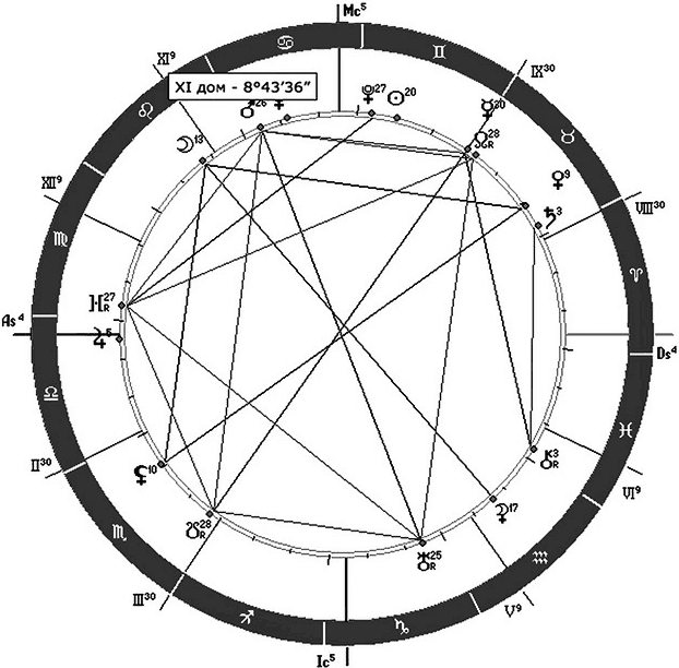 • Гороскоп, построенный с помощью бесплатной версии программы «Астропроцессор ZET», которую можно найти на сайте http://astrozet.net, также вполне узнаваем, он показан на рис. 1.11.