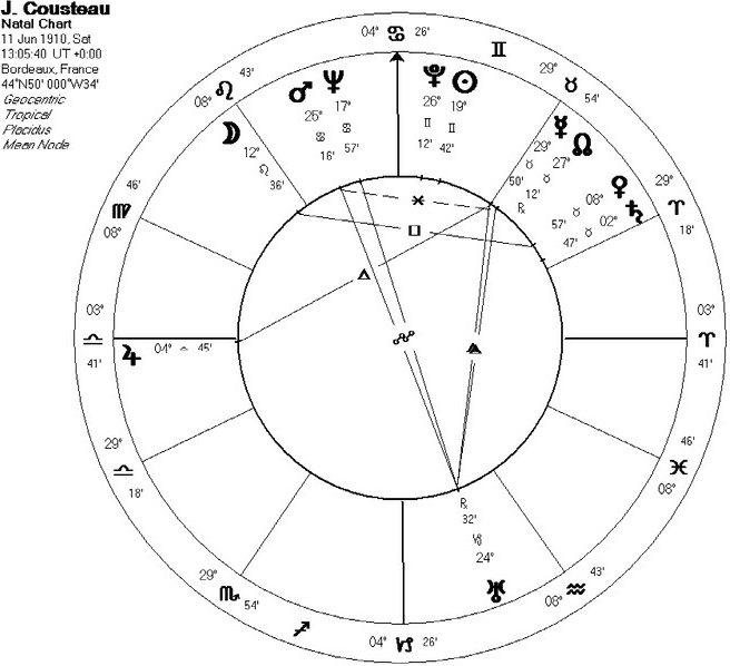 В гороскопе Кусто ключевой планетой является, скорее всего, Марс – четыре аспекта, в том числе точная оппозиция с Ураном. Другой кандидат на эту роль – Меркурий. Тоже четыре аспекта, и хотя напряженных среди них нет, на Меркурий замыкается все та же точная оппозиция Марс – Уран. Поскольку Марс и Меркурий имеют аспект и друг с другом, можно сказать, что они вдвоем образуют важнейшую ключевую комбинацию гороскопа.